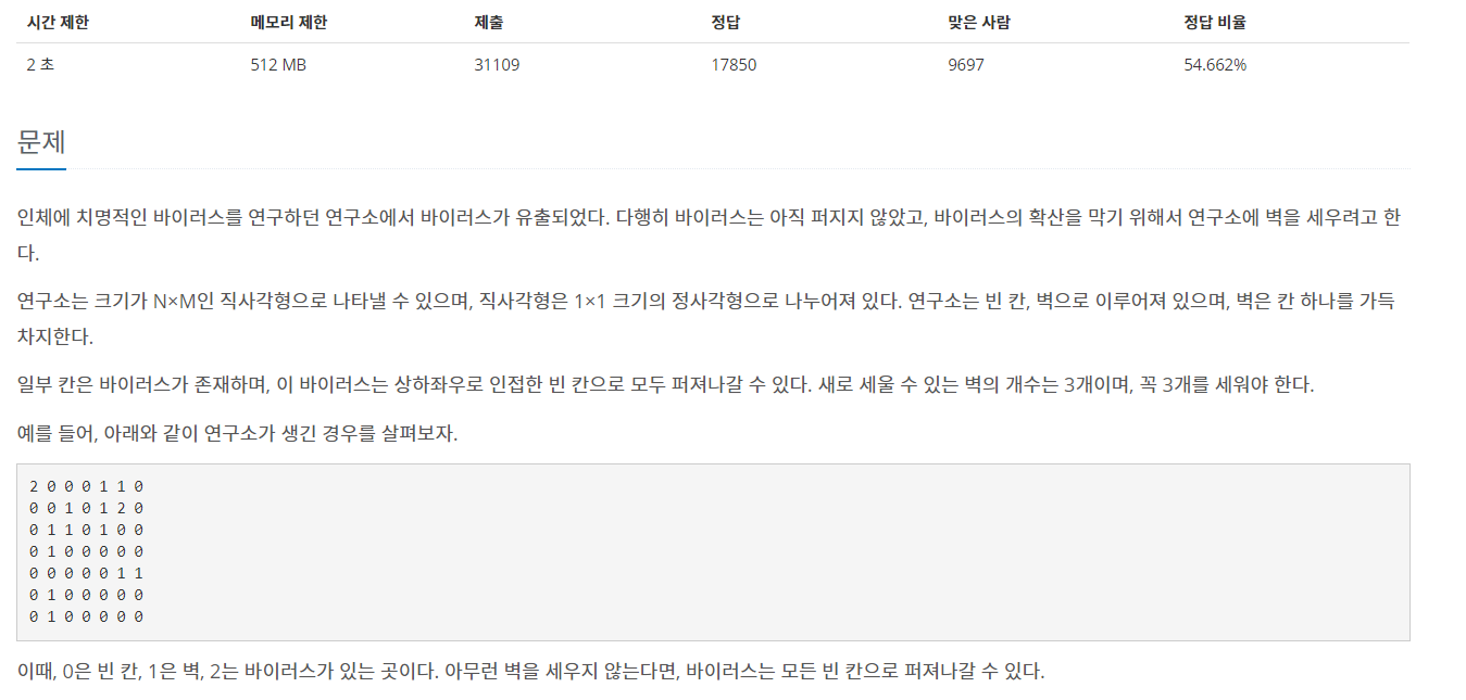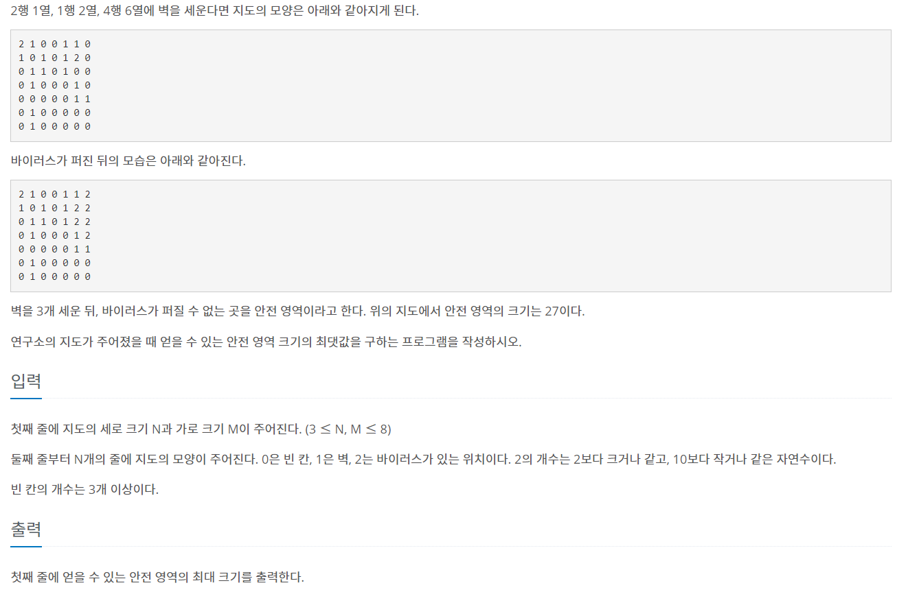 벽 3개를 새로 새우는 모든 경우의 수에 대해 바이러스가 확산되고 나서의 안전영역을 구하는 문제였다.