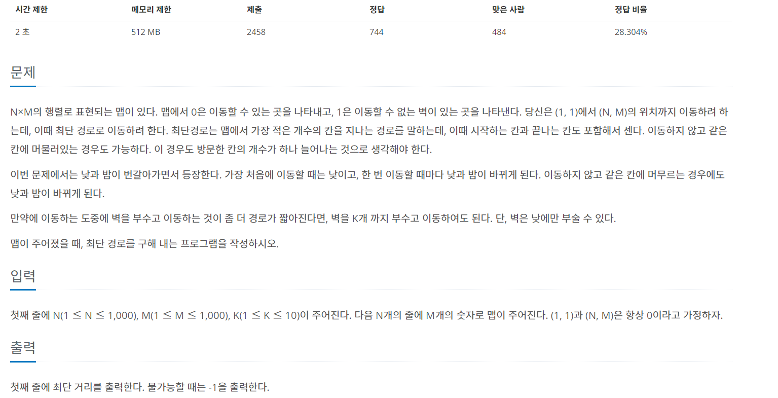 3.visited를 3차원 배열로 선언 (visited[x][y][b] == 좌표(x,y)에 b번 벽을 부수고 방문한 적 있는지)
