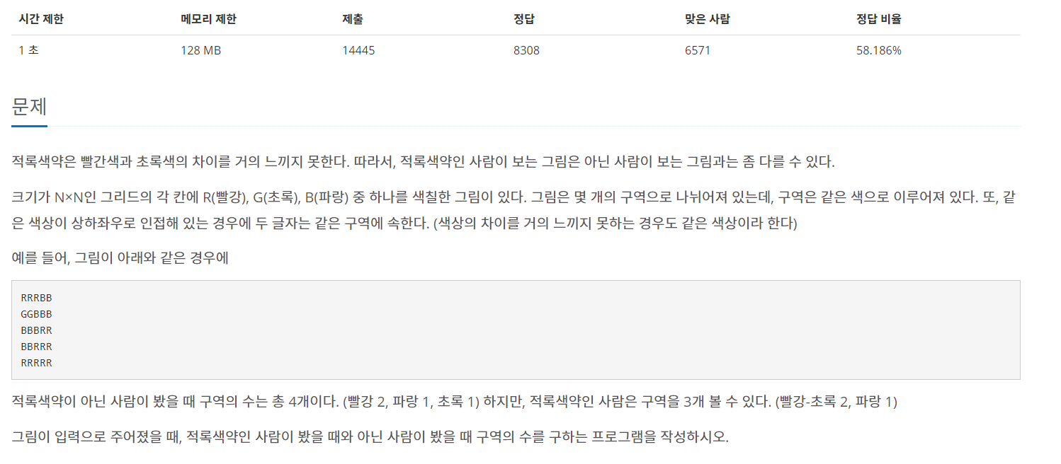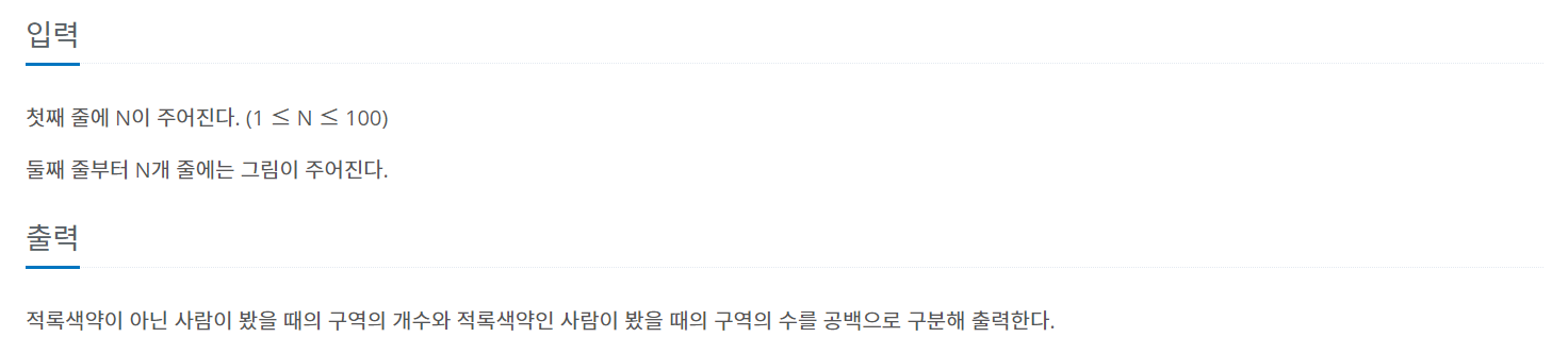 적록색약은 빨간색과 초록색의 차이를 거의 느끼지 못한다. 따라서, 적록색약인 사람이 보는 그림은 아닌 사람이 보는 그림과는 좀 다를 수 있다. 크기가 N×N인 그리드의 각 칸에 R(빨강), G(초록)