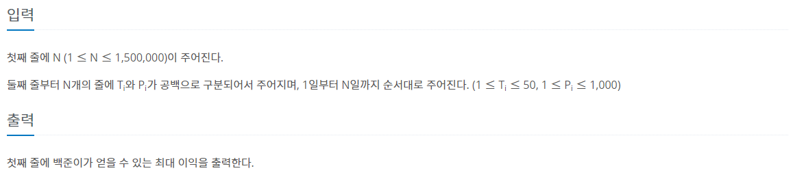 첫째 줄에 N (1 ≤ N ≤ 1,500,000)이 주어진다. 둘째 줄부터 N개의 줄에 Ti와 Pi가 공백으로 구분되어서 주어지며, 1일부터 N일까지 순서대로 주어진다. (1 ≤ Ti ≤ 50, 1 ≤ Pi ≤ 1,000)