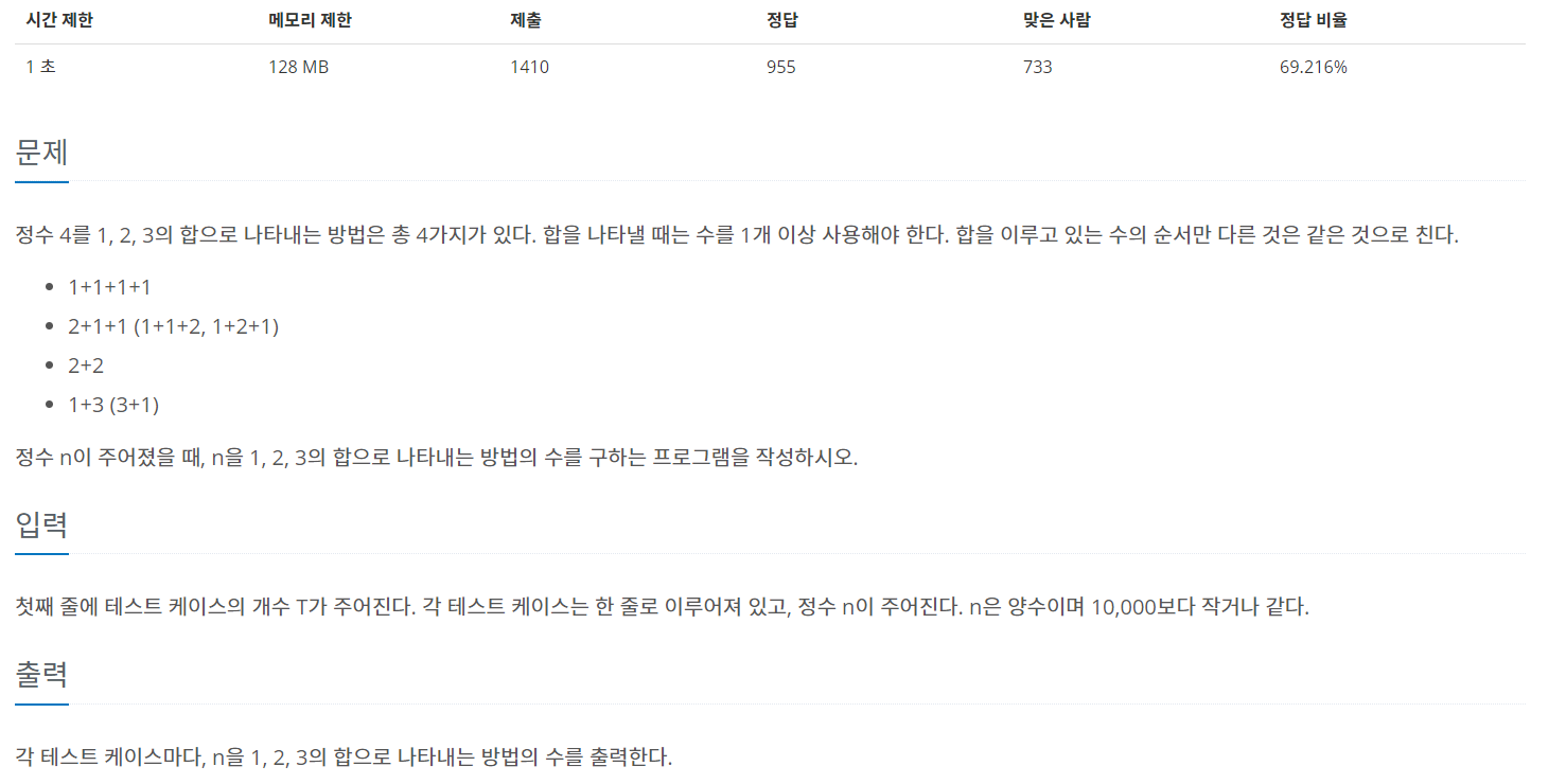 정수 4를 1, 2, 3의 합으로 나타내는 방법은 총 4가지가 있다. 합을 나타낼 때는 수를 1개 이상 사용해야 한다. 합을 이루고 있는 수의 순서만 다른 것은 같은 것으로 친다. 1+1+1+1 2+1+1 (1+1+2, 1+2+1) 2+2