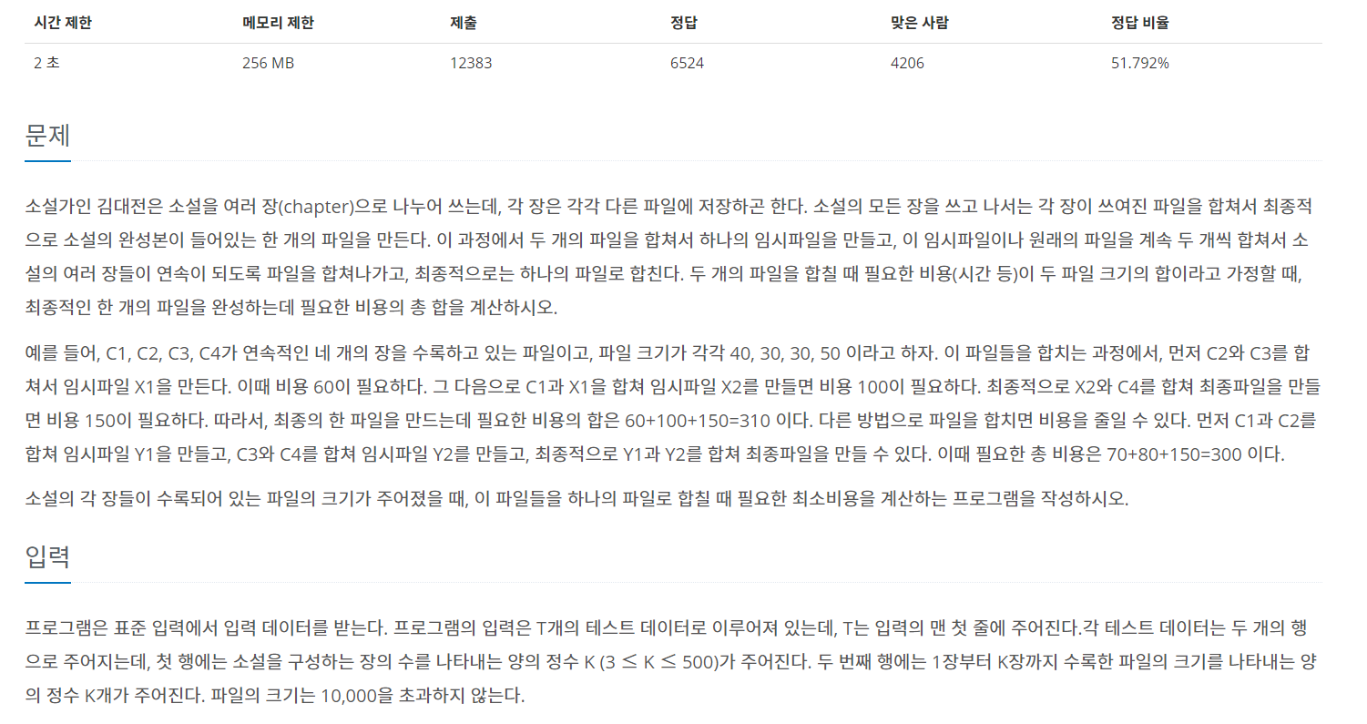 DP[i][j] : i번째 장부터 j번째 장까지 어떤 순서로 합쳐야 최소비용이 나오는지(그 때의 최소비용)