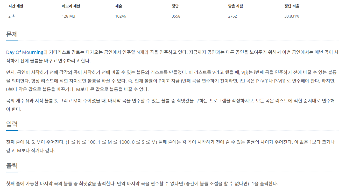 첫째 줄에 N, S, M이 주어진다. (1 ≤ N ≤ 100, 1 ≤ M ≤ 1000, 0 ≤ S ≤ M) 둘째 줄에는 각 곡이 시작하기 전에 줄 수 있는 볼륨의 차이가 주어진다. 이 값은 1보다 크거나 같고, M보다 작거나 같다.