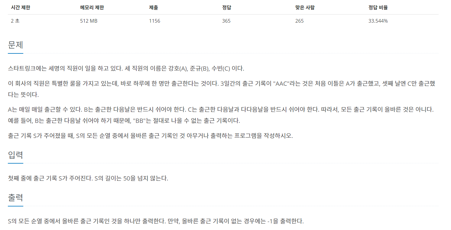 문제 링크: https://www.acmicpc.net/problem/14238 14238번: 출근 기록 스타트링크에는 세명의 직원이 일을 하고 있다. 세 직원의 이름은 강호(A), 준규(B), 수빈(C) 이다. 이 회사의 직원은 특별한 룰을 가지고.