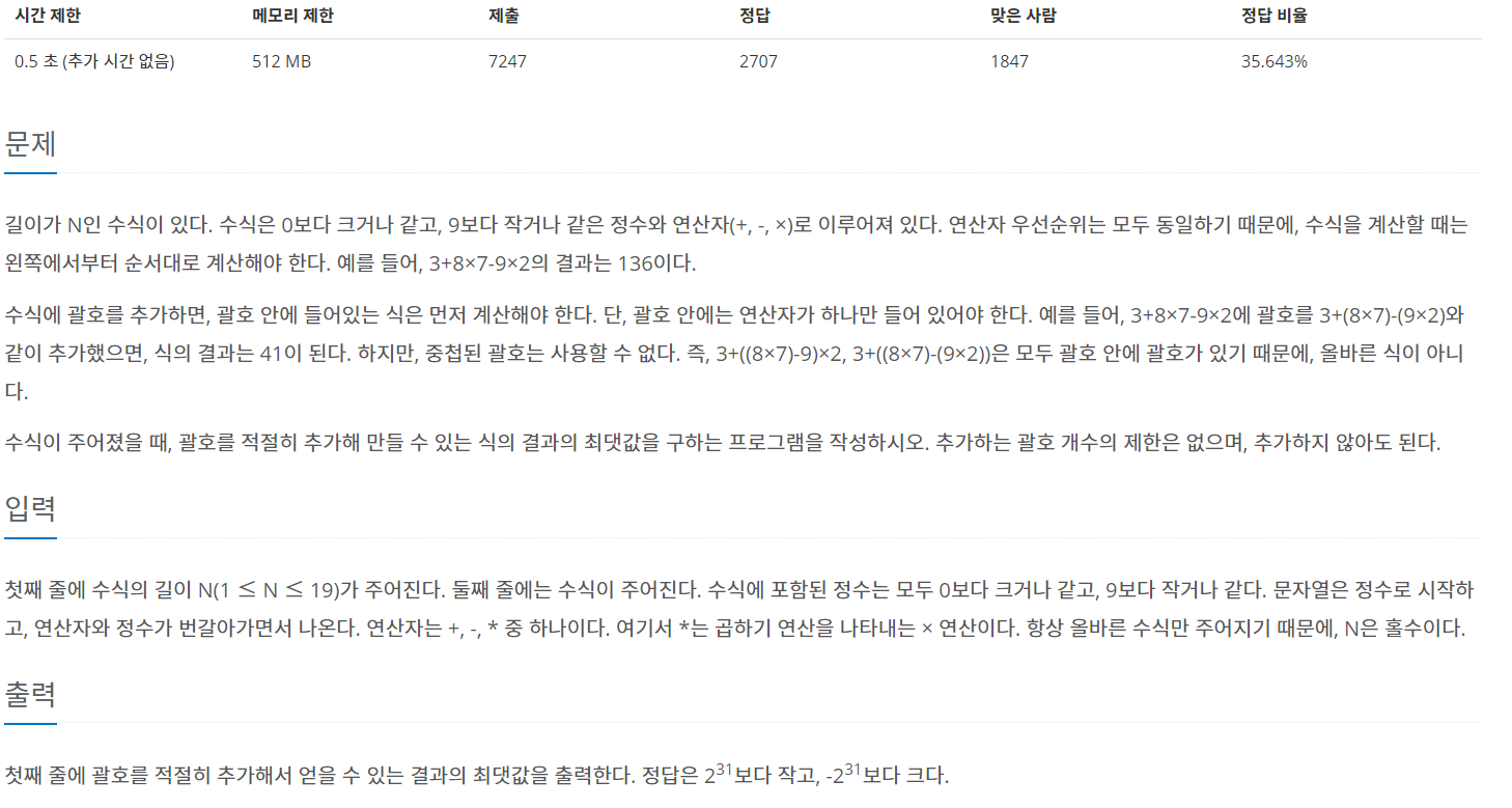 첫째 줄에 수식의 길이 N(1 ≤ N ≤ 19)가 주어진다. 둘째 줄에는 수식이 주어진다. 수식에 포함된 정수는 모두 0보다 크거나 같고, 9보다 작거나 같다. 문자열은 정수로 시작하고, 연산자와 정수가