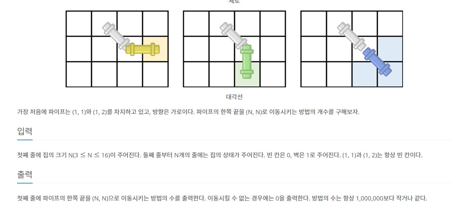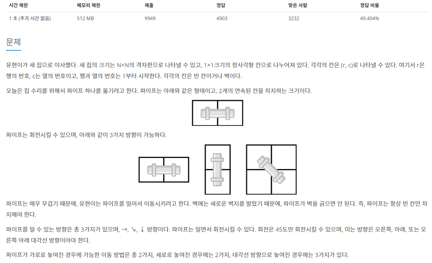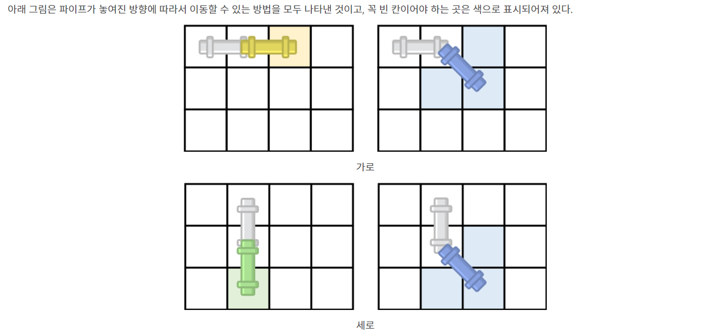 오른쪽, 아래, 오른쪽 아래 대각선 방향으로만 움직이므로 파이프의 오른쪽 부분(이동방향쪽 한 칸)만 고려하면 된다.