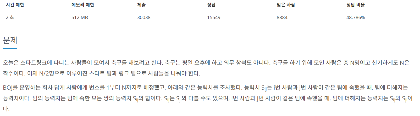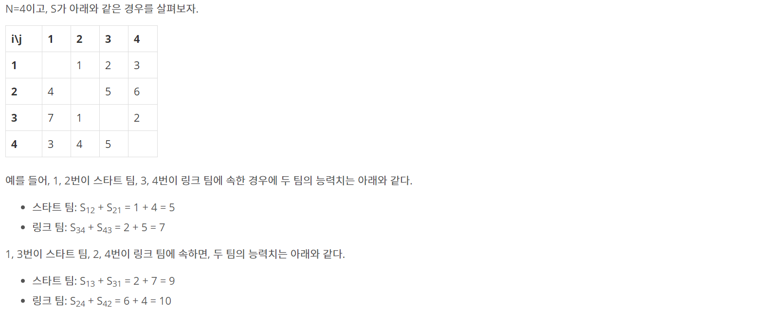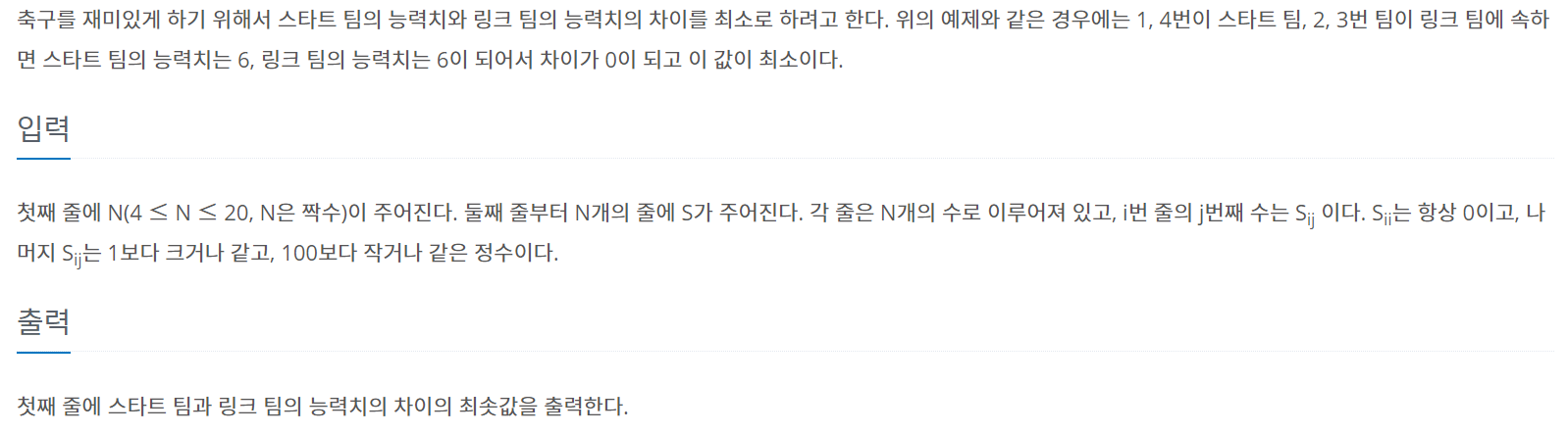 매 경우의 수마다 스타트 팀과 링크 팀의 능력치 차를 계산하여 최소값을 갱신한다.