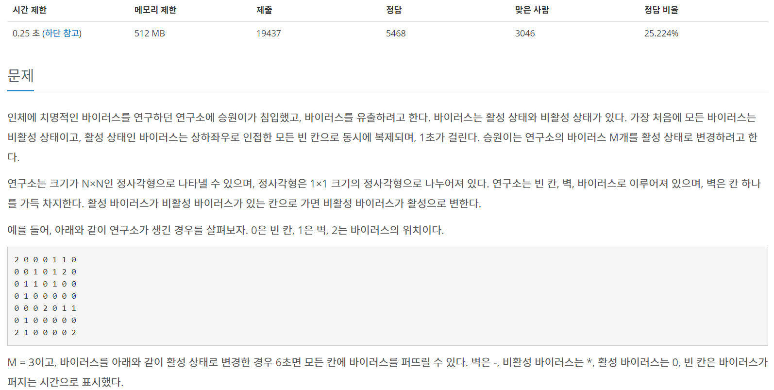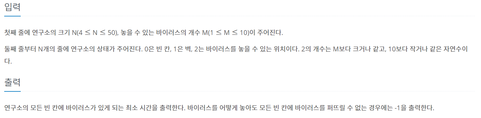 dfs 조합으로 활성화시킬 바이러스 M개를 뽑고, 그에 따라 bfs를 이용하여 확산시켜야 하는 문제였다.
