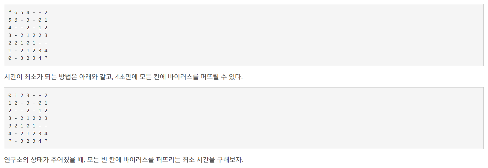 각 경우마다 모든 빈 칸에 바이러스 퍼뜨리는 시간은 가장 마지막으로 방문되는 빈칸이 채워지는 시간이다.