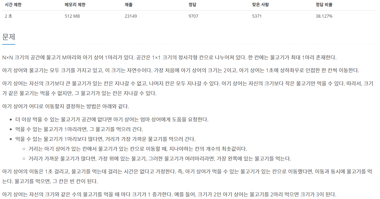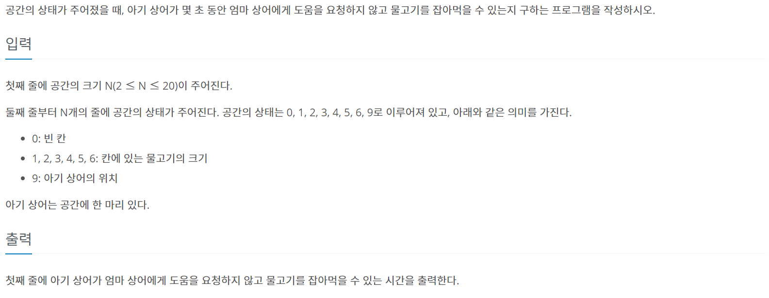 N×N 크기의 공간에 물고기 M마리와 아기 상어 1마리가 있다. 공간은 1×1 크기의 정사각형 칸으로 나누어져 있다. 한 칸에는 물고기가 최대 1마리 존재한다. 아기 상어와 물고기는 모두 크기를 가��