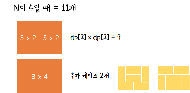 dp[x] = 3 * dp[x-2] + 2 * dp[x-4] + ··· + 2 * dp[0] (마지막 항은 추가케이스 2개 더하는 항)