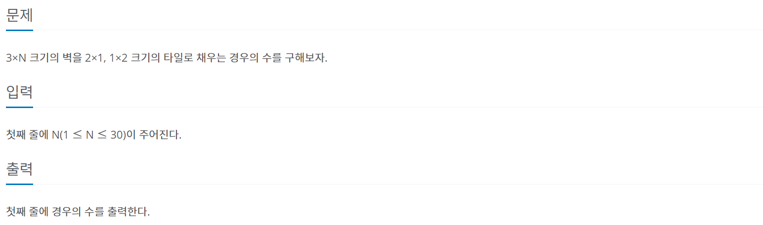 문제 3×N 크기의 벽을 2×1, 1×2 크기의 타일로 채우는 경우의 수를 구해보자. 입력 첫째 줄에 N(1 ≤ N ≤ 30)이 주어진다. 출력 첫째 줄에 경우의 수를 출력한다. 예제 입력 1 복사 2 예제 출력 1 복��