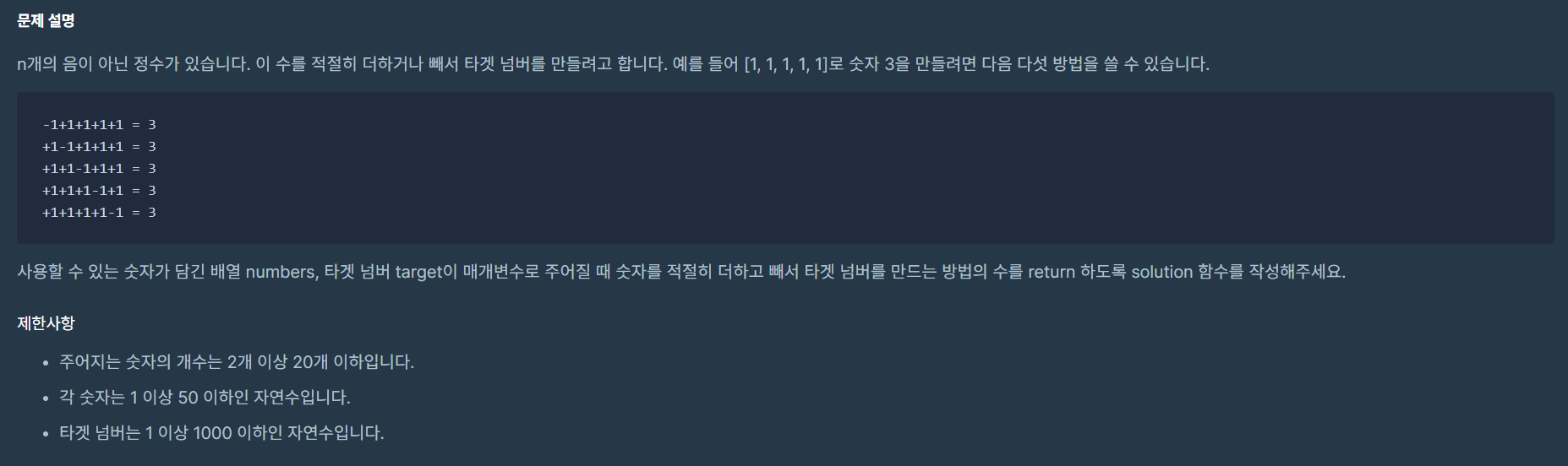 n개의 음이 아닌 정수가 있습니다. 이 수를 적절히 더하거나 빼서 타겟 넘버를 만들려고 합니다. 예를 들어 [1, 1, 1, 1, 1]로 숫자 3을 만들려면 다음 다섯 방법을 쓸 수 있습니다. -1+1+1+1+1 = 3 +1-1+1+1+