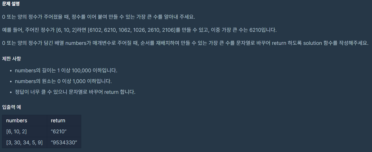 0 또는 양의 정수가 주어졌을 때, 정수를 이어 붙여 만들 수 있는 가장 큰 수를 알아내 주세요. 예를 들어, 주어진 정수가 [6, 10, 2]라면 [6102, 6210, 1062, 1026, 2610, 2106]를 만들 수 있고, 이중 가장 큰