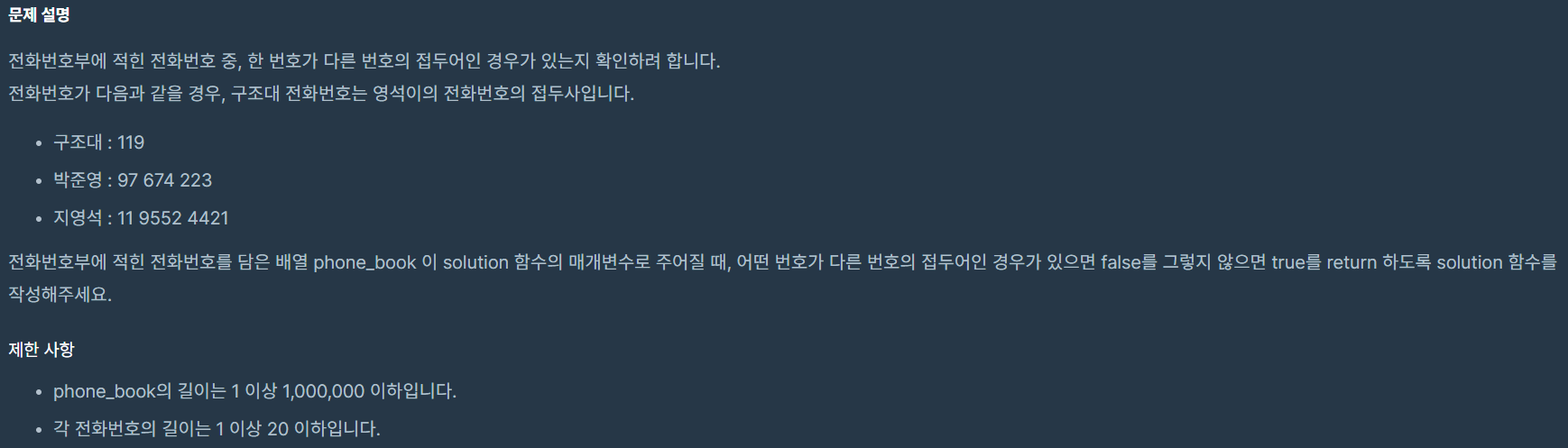 질문하기에 어떤 분이 phone_book을 정렬한 상태로 현재 번호가 바로 뒤의 번호의 접두어가 아니면 그 뒤로도 아니므로 패스할 수 있다고 올려주셔서 그대로 풀었더니 통과했다.