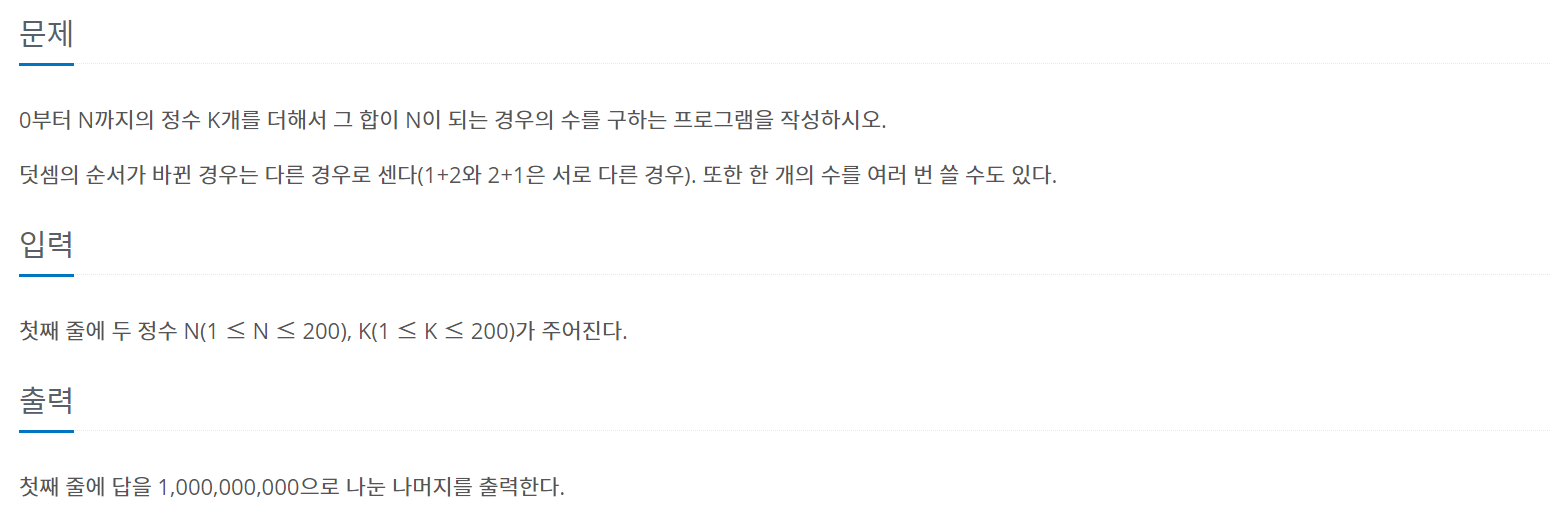 dp[i][j] : 0부터 j까지의 정수 i개를 더해서 그 합이 j가 되는 경우의 수