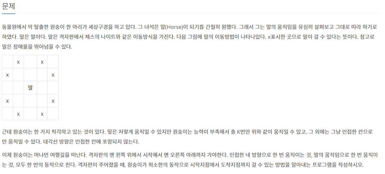 말처럼 이동한 횟수가 K번 미만이면 말처럼 이동한 칸을 queue에 넣는다. 그리고 원숭이로 이동하는 경우 또한 queue에 넣어야한다.