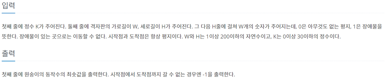 첫째 줄에 정수 K가 주어진다. 둘째 줄에 격자판의 가로길이 W, 세로길이 H가 주어진다. 그 다음 H줄에 걸쳐 W개의 숫자가 주어지는데, 0은 아무것도 없는 평지, 1은 장애물을 뜻한다. 장애물이 있