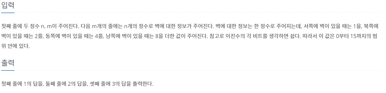 첫째 줄에 두 정수 n, m이 주어진다. 다음 m개의 줄에는 n개의 정수로 벽에 대한 정보가 주어진다. 벽에 대한 정보는 한 정수로 주어지는데, 서쪽에 벽이 있을 때는 1을, 북쪽에 벽이 있을 때는 2를,