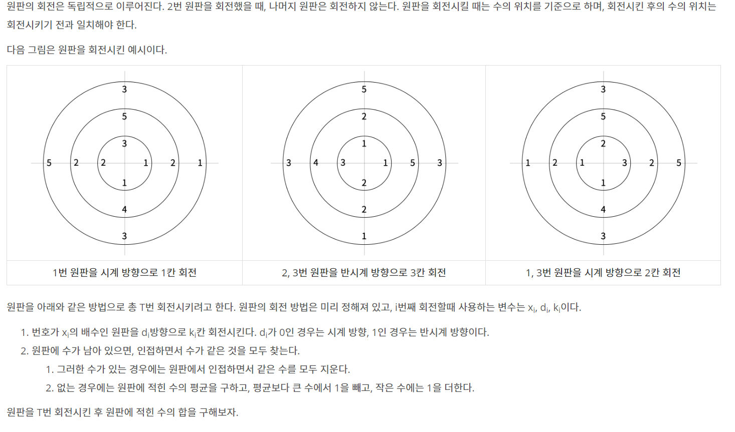 1. 원판은 2차원 배열 int Circle[][]로 구현하였다. Circle[i][j]는 i번 원판의 j번째 숫자를 의미한다.