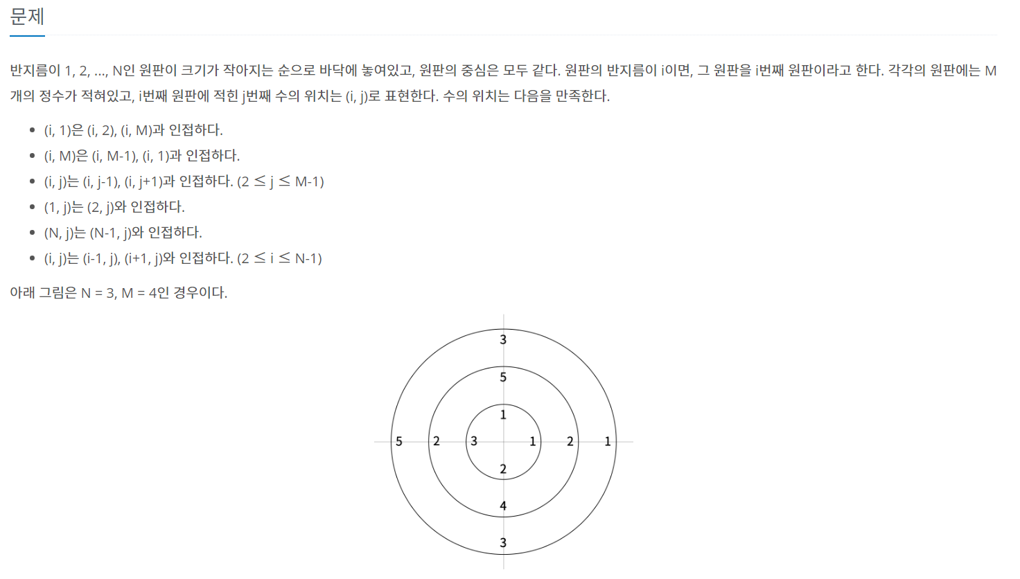 반지름이 1, 2, ..., N인 원판이 크기가 작아지는 순으로 바닥에 놓여있고, 원판의 중심은 모두 같다. 원판의 반지름이 i이면, 그 원판을 i번째 원판이라고 한다. 각각의 원판에는 M개의 정수가 적혀