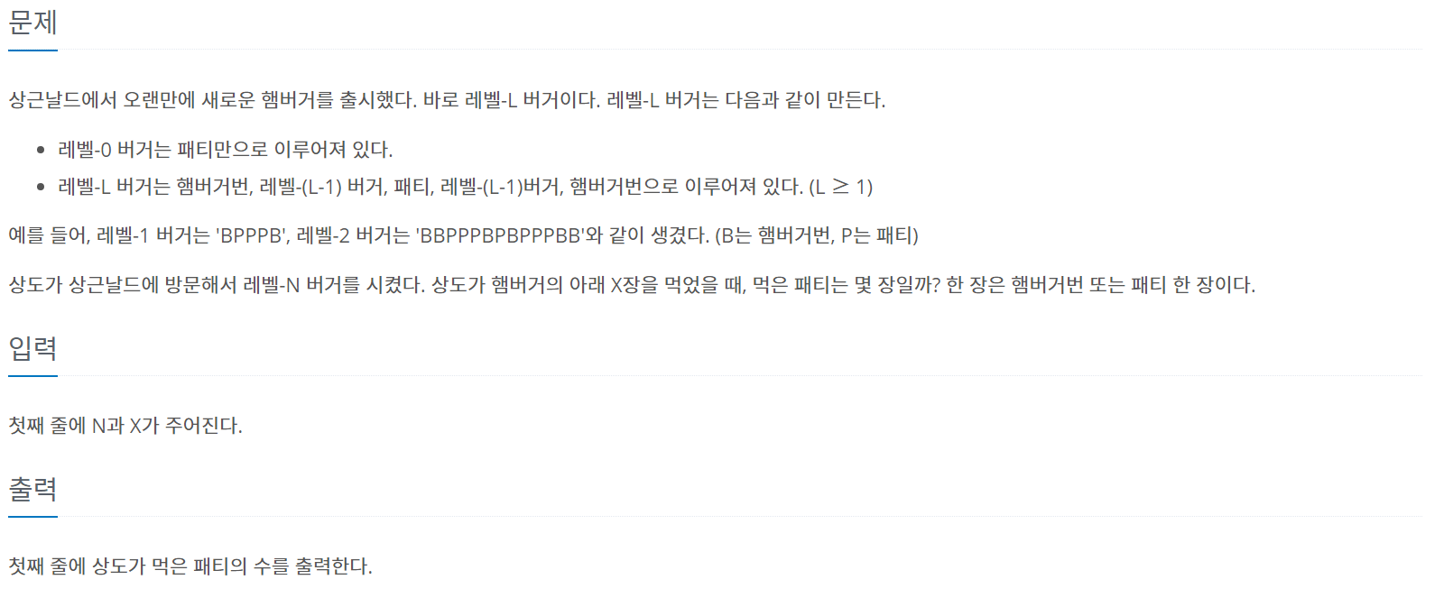 상근날드에서 오랜만에 새로운 햄버거를 출시했다. 바로 레벨-L 버거이다. 레벨-L 버거는 다음과 같이 만든다. 레벨-0 버거는 패티만으로 이루어져 있다. 레벨-L 버거는 햄버거번, 레벨-(L-1) 버거,