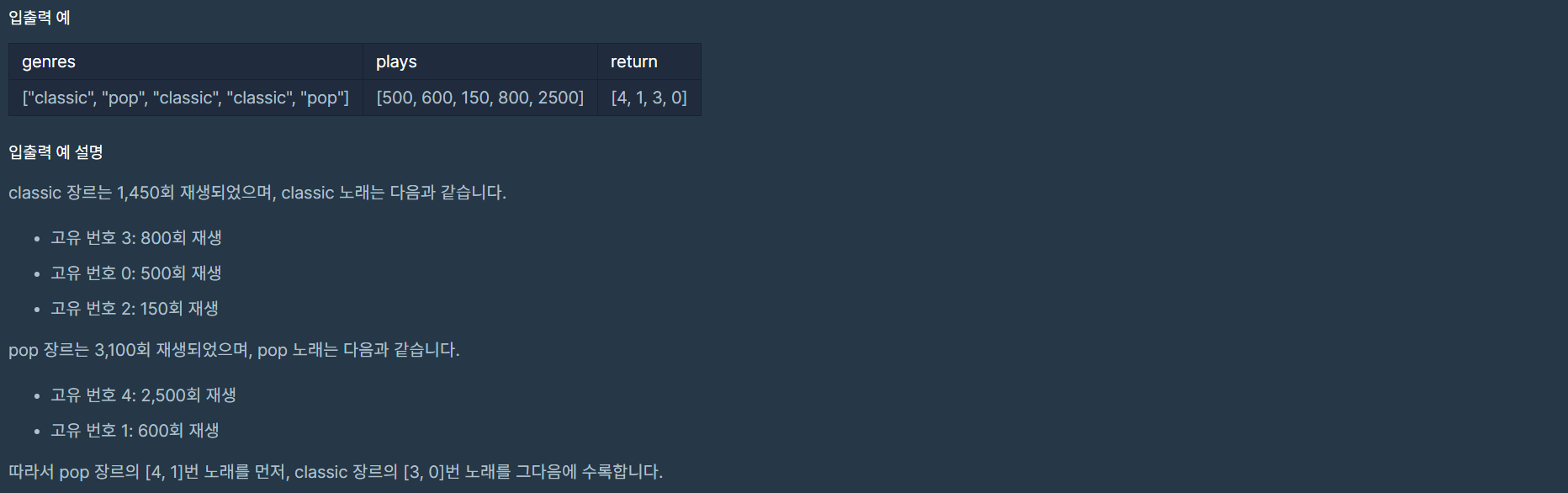 5. 재생 횟수 많은 장르 순서대로 각각 속한 노래들을 재생 횟수 많은 순으로 Total정렬 -> 가장 앞의 두 곡씩 answer에 저장