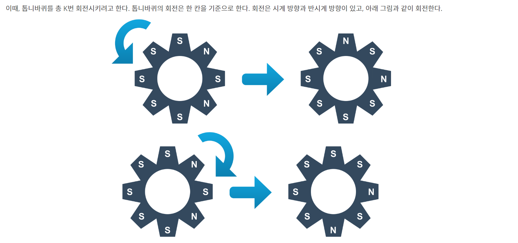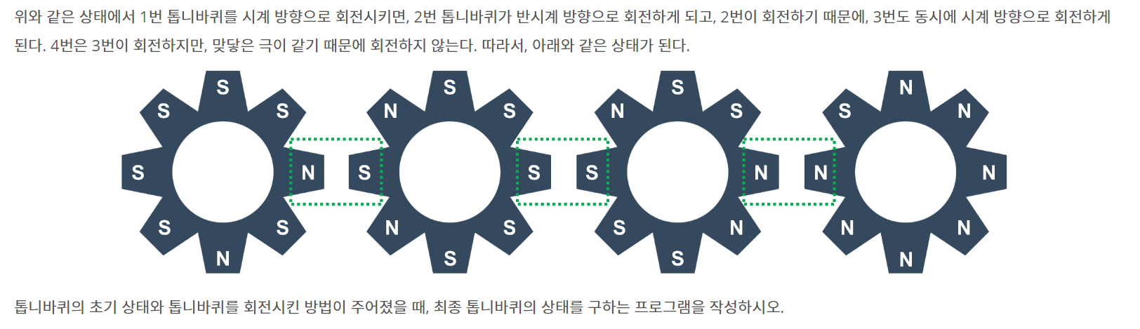 문제에 나온 톱니바퀴의 회전 규칙을 구현하는 문제였다.