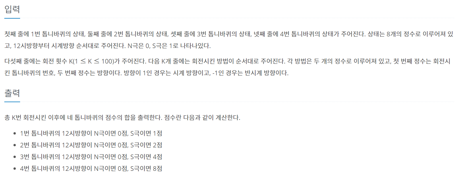 w[n][i]에 n번 톱니바퀴의 i번째 칸의 극을 저장하였다. 그리고 K번 톱니바퀴 번호와 방향을 받을때마다 톱니바퀴들을 회전시켰다.