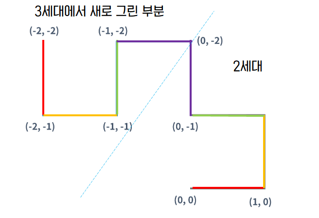 그리고 다음세대에 새로 그려지는 드래곤 커브가 어떤 순서로 그려지는 지 찾았다. 앞세대의 드래곤 커브를 복사하여 끝 부분에 붙인다고 했을 때, 앞 세대에서 가장 마지막에 그려진 것부터 역순으로 그려진다.