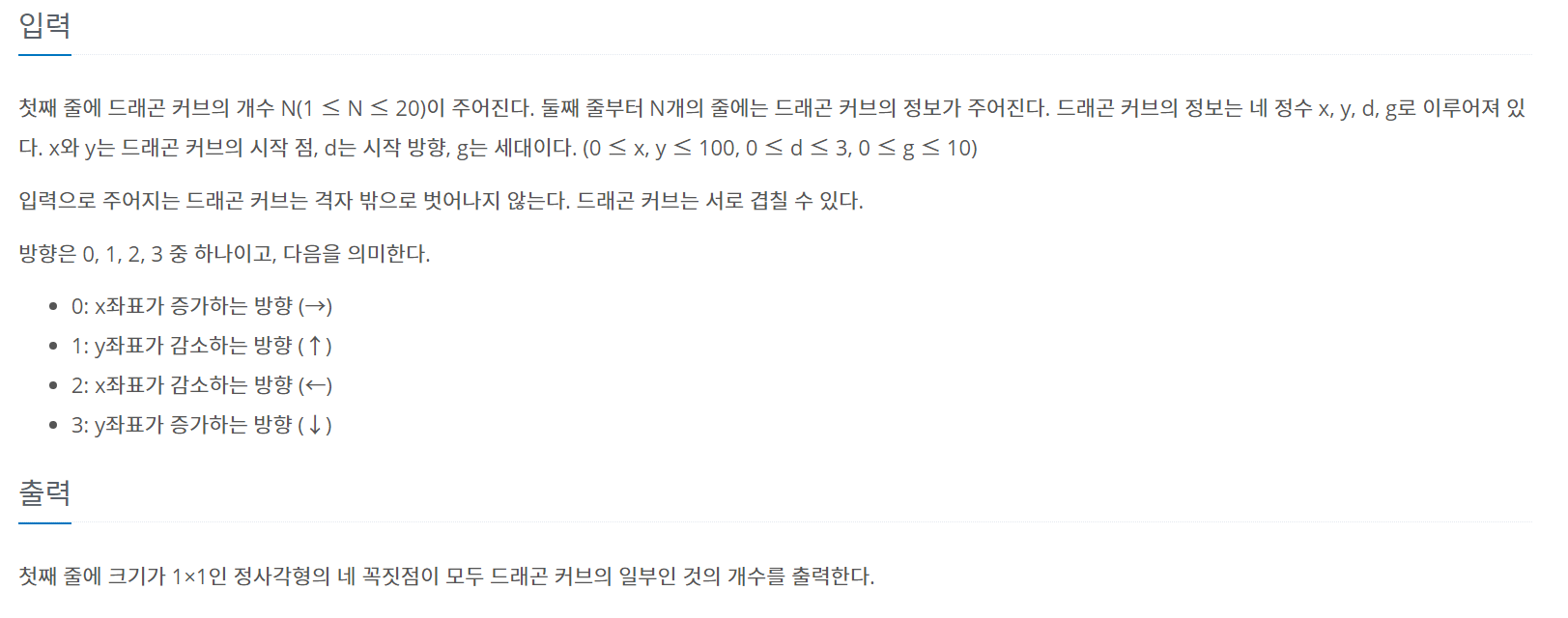 첫째 줄에 드래곤 커브의 개수 N(1 ≤ N ≤ 20)이 주어진다. 둘째 줄부터 N개의 줄에는 드래곤 커브의 정보가 주어진다. 드래곤 커브의 정보는 네 정수 x, y, d, g로 이루어져 있다. x와 y는 드래곤 커
