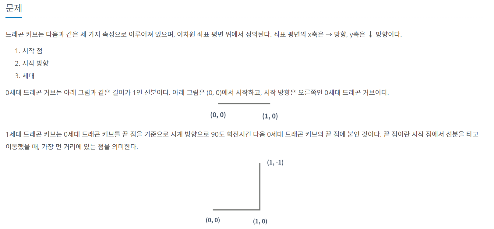 위의 규칙들을 따라서 드래곤 커브를 그릴때마다 그 방향들을 다음세대를 위해 저장하고, 다음 세대를 그릴 때 가장 마지막에 저장된 방향부터 방향 규칙에 따라 변경후 드래곤 커브를 그려주면 된다.
