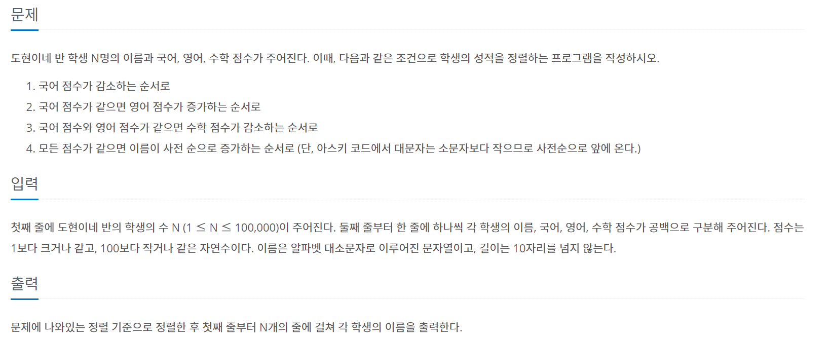 첫째 줄에 도현이네 반의 학생의 수 N (1 ≤ N ≤ 100,000)이 주어진다. 둘째 줄부터 한 줄에 하나씩 각 학생의 이름, 국어, 영어, 수학 점수가 공백으로 구분해 주어진다. 점수는 1보다 크거나 같고, 1