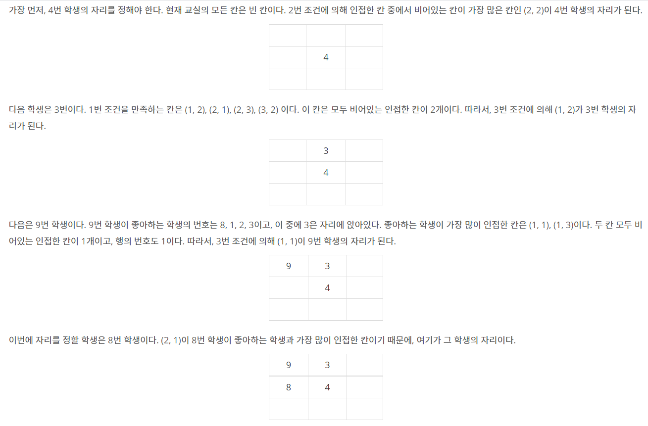 빈칸들마다 주변에 좋아하는 학생 수, 빈칸 수를 저장하여 조건에 맞게 정렬한다. 정렬했을 때 제일 앞에 있는 좌표에 해당 학생을 배치시킨다.