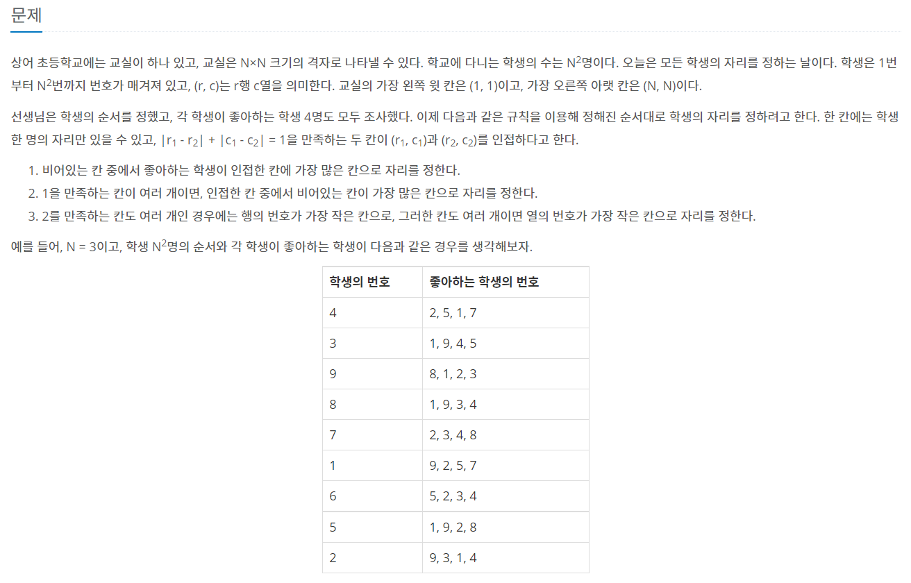 상어 초등학교에는 교실이 하나 있고, 교실은 N×N 크기의 격자로 나타낼 수 있다. 학교에 다니는 학생의 수는 N2명이다. 오늘은 모든 학생의 자리를 정하는 날이다. 학생은 1번부터 N2번까지 번호