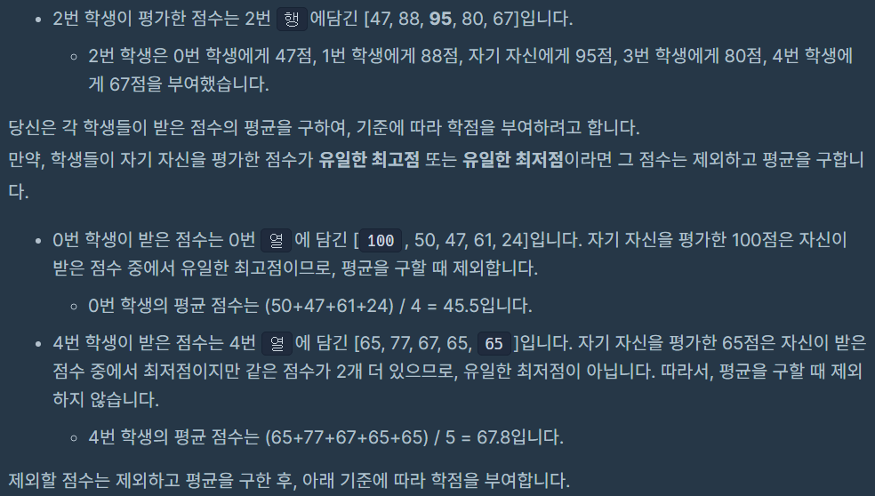 i번 학생이 자신에게 준 점수가 자신이 받은 점수 중 유일한 최저점이거나 유일한 최고점이면 평균을 구하는 식에서 제외한다.