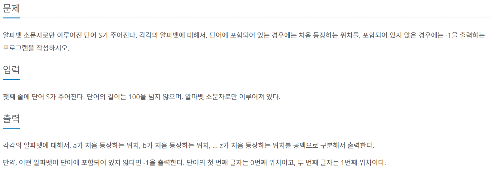 각각의 알파벳에 대해서, a가 처음 등장하는 위치, b가 처음 등장하는 위치, ... z가 처음 등장하는 위치를 공백으로 구분해서 출력한다. 만약, 어떤 알파벳이 단어에 포함되어 있지 않다면 -1을 출