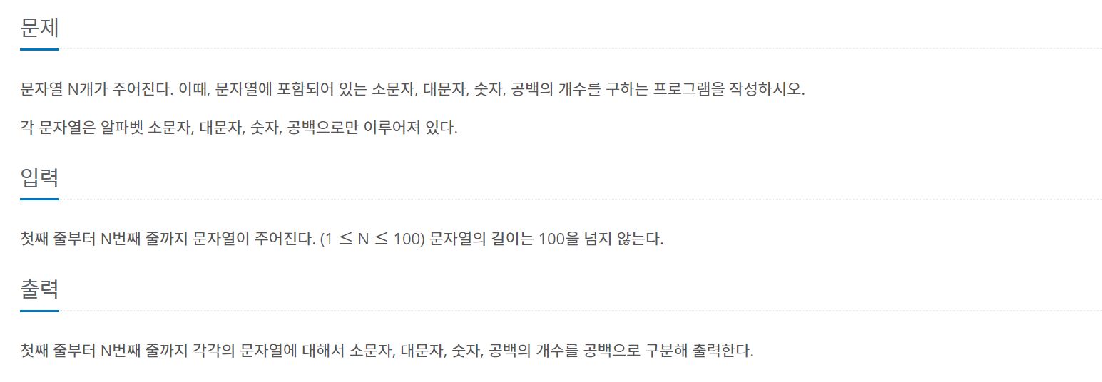문자열 N개가 주어진다. 이때, 문자열에 포함되어 있는 소문자, 대문자, 숫자, 공백의 개수를 구하는 프로그램을 작성하시오. 각 문자열은 알파벳 소문자, 대문자, 숫자, 공백으로만 이루어져 있