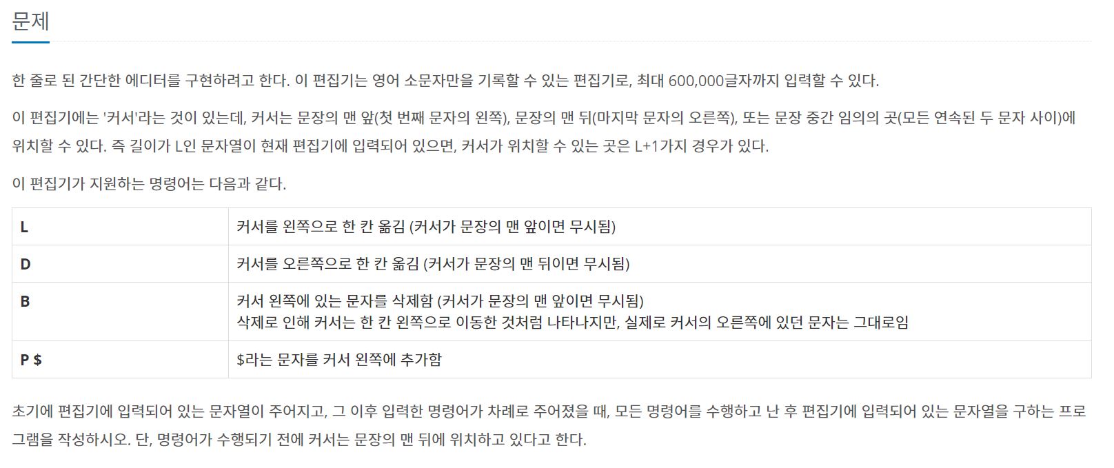 문제 한 줄로 된 간단한 에디터를 구현하려고 한다. 이 편집기는 영어 소문자만을 기록할 수 있는 편집기로, 최대 600,000글자까지 입력할 수 있다. 이 편집기에는 '커서'라는 것이 있는데, 커서는