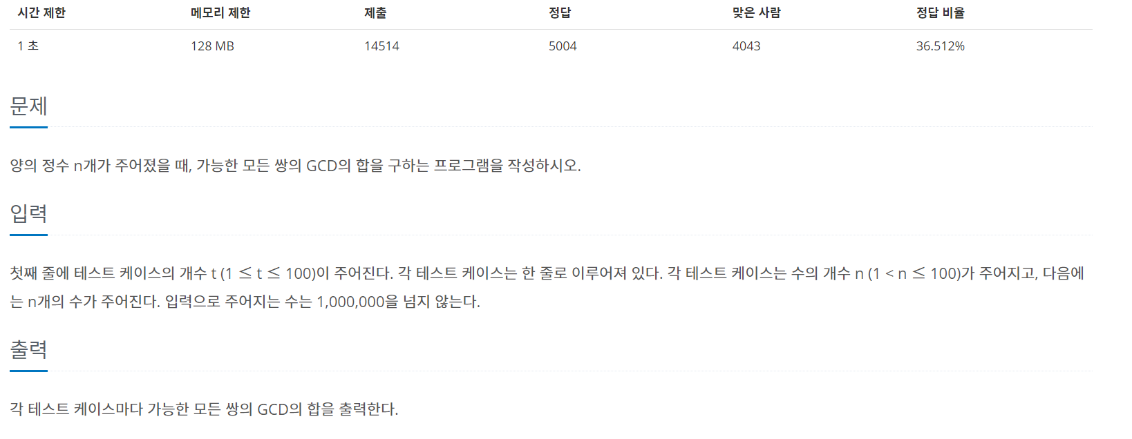 문제 양의 정수 n개가 주어졌을 때, 가능한 모든 쌍의 GCD의 합을 구하는 프로그램을 작성하시오. 입력 첫째 줄에 테스트 케이스의 개수 t (1 ≤ t ≤ 100)이 주어진다. 각 테스트 케이스는 한 줄로 ��