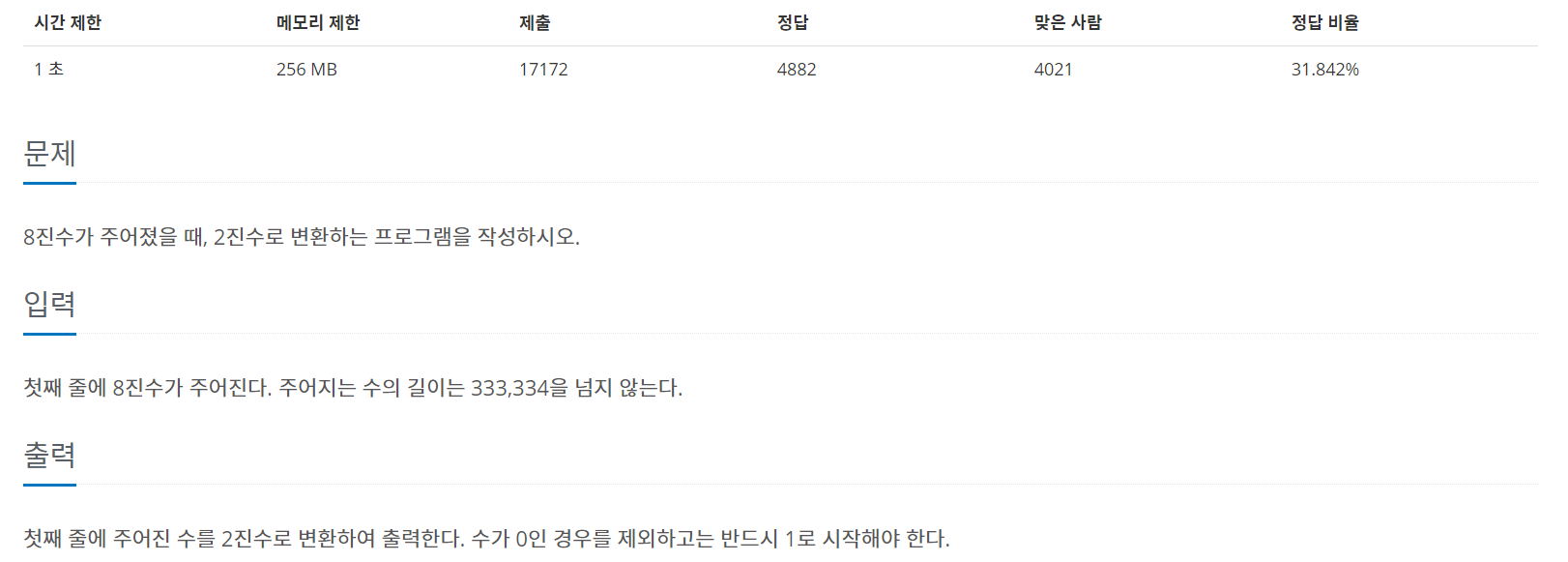 첫째 줄에 8진수가 주어진다. 주어지는 수의 길이는 333,334을 넘지 않는다.