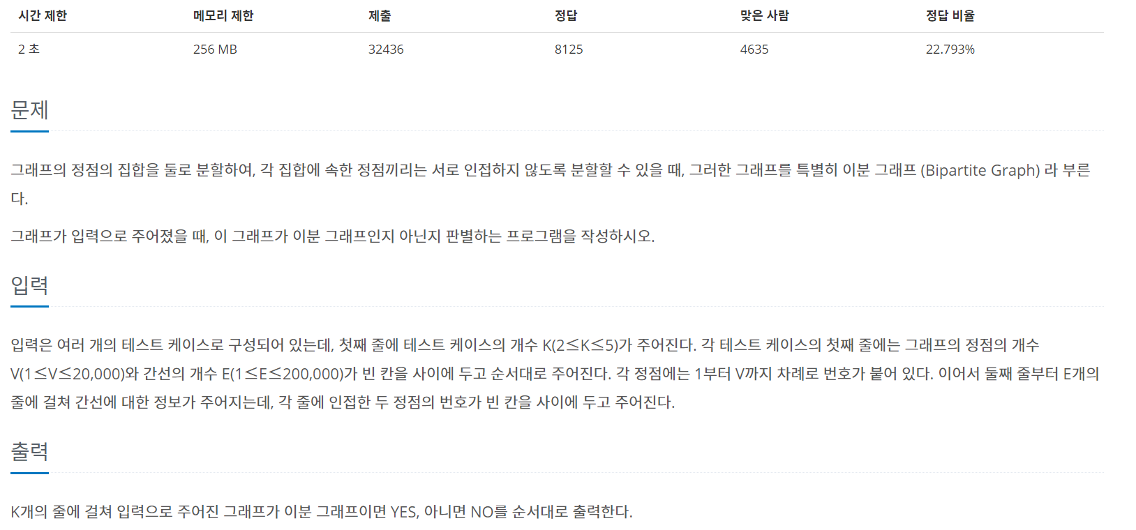 입력은 여러 개의 테스트 케이스로 구성되어 있는데, 첫째 줄에 테스트 케이스의 개수 K(2≤K≤5)가 주어진다. 각 테스트 케이스의 첫째 줄에는 그래프의 정점의 개수 V(1≤V≤20,000)와 간선의 개수