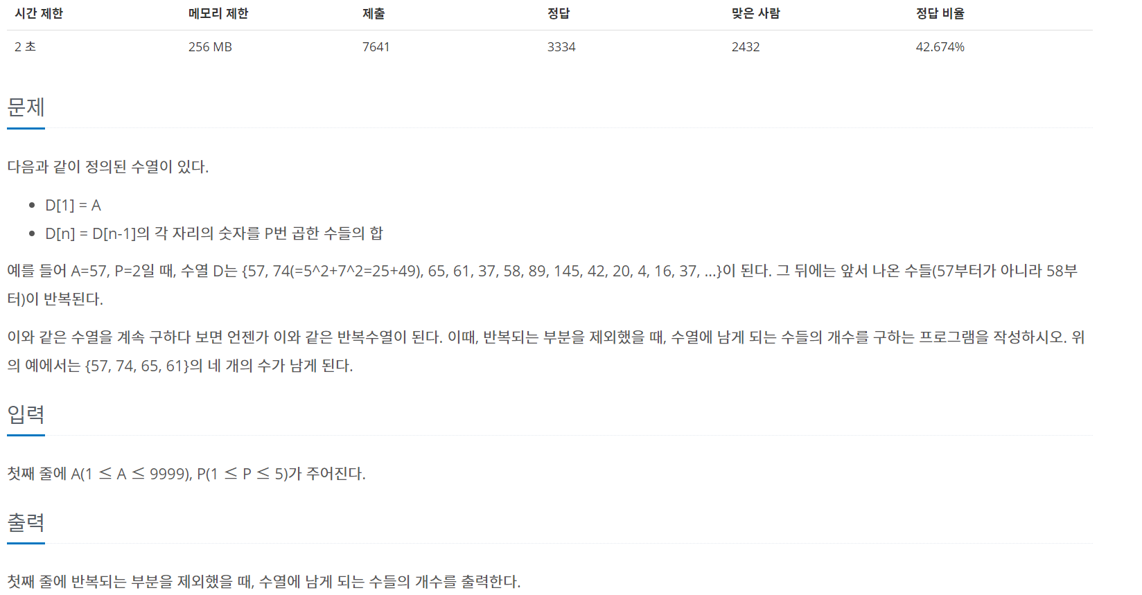 ex) 37, 58, 89, 145, 42, 20, 4, 16, 37, 58, 89, 145, 42, 20, 4, 16, 37, ... 이렇게 37이 세번 나와야 반복수열이 되었다는 것을 알 수 있다.