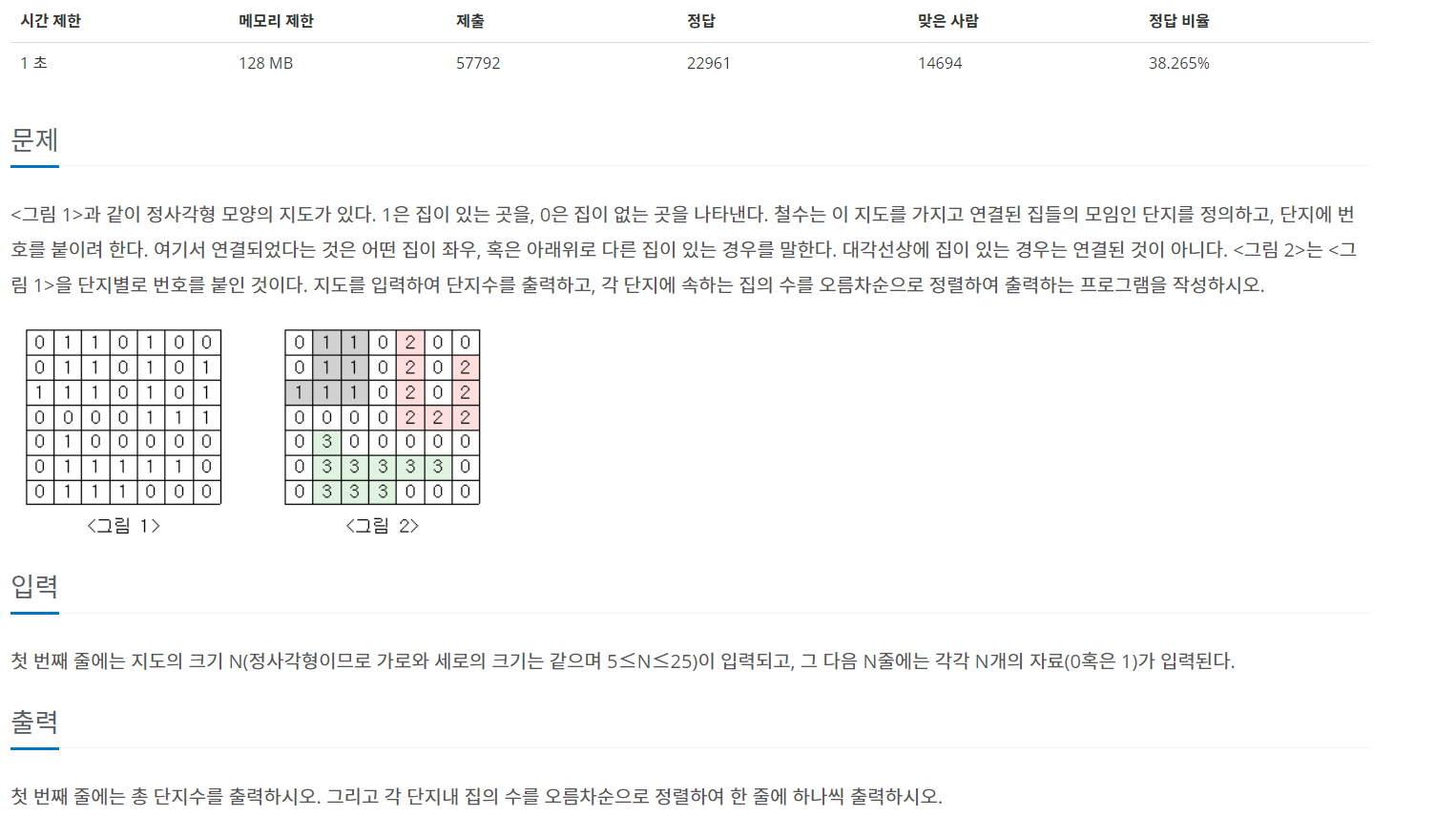 <그림 1>과 같이 정사각형 모양의 지도가 있다. 1은 집이 있는 곳을, 0은 집이 없는 곳을 나타낸다. 철수는 이 지도를 가지고 연결된 집들의 모임인 단지를 정의하고, 단지에 번호를 붙이려 한다. �