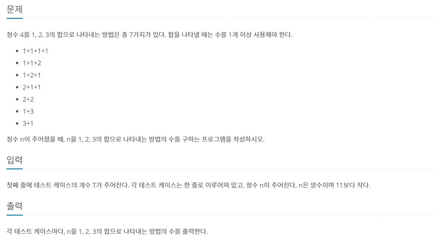 문제 정수 4를 1, 2, 3의 합으로 나타내는 방법은 총 7가지가 있다. 합을 나타낼 때는 수를 1개 이상 사용해야 한다. 1+1+1+1 1+1+2 1+2+1 2+1+1 2+2 1+3 3+1 정수 n이 주어졌을 때, n을 1, 2, 3의 합으로 나타내는