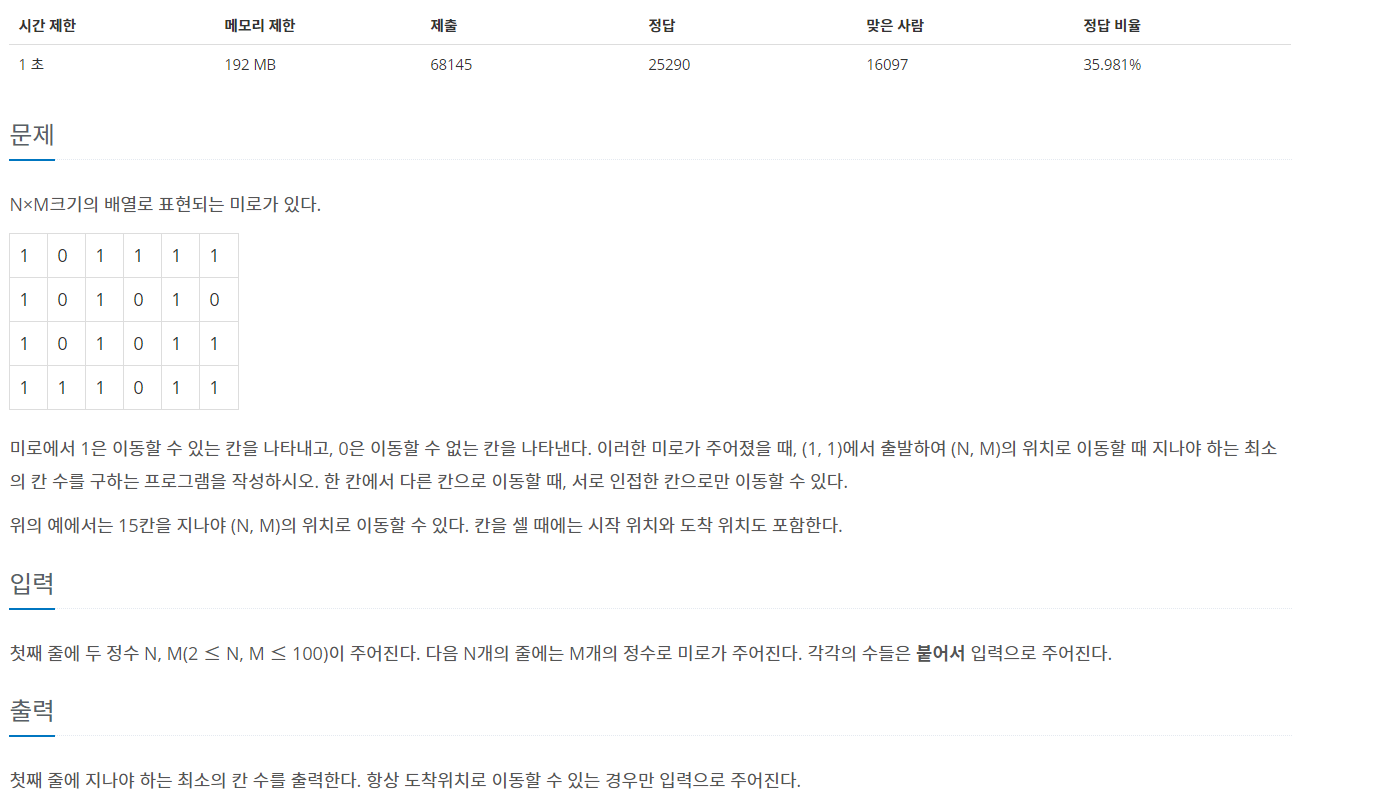 첫째 줄에 두 정수 N, M(2 ≤ N, M ≤ 100)이 주어진다. 다음 N개의 줄에는 M개의 정수로 미로가 주어진다. 각각의 수들은 붙어서 입력으로 주어진다.