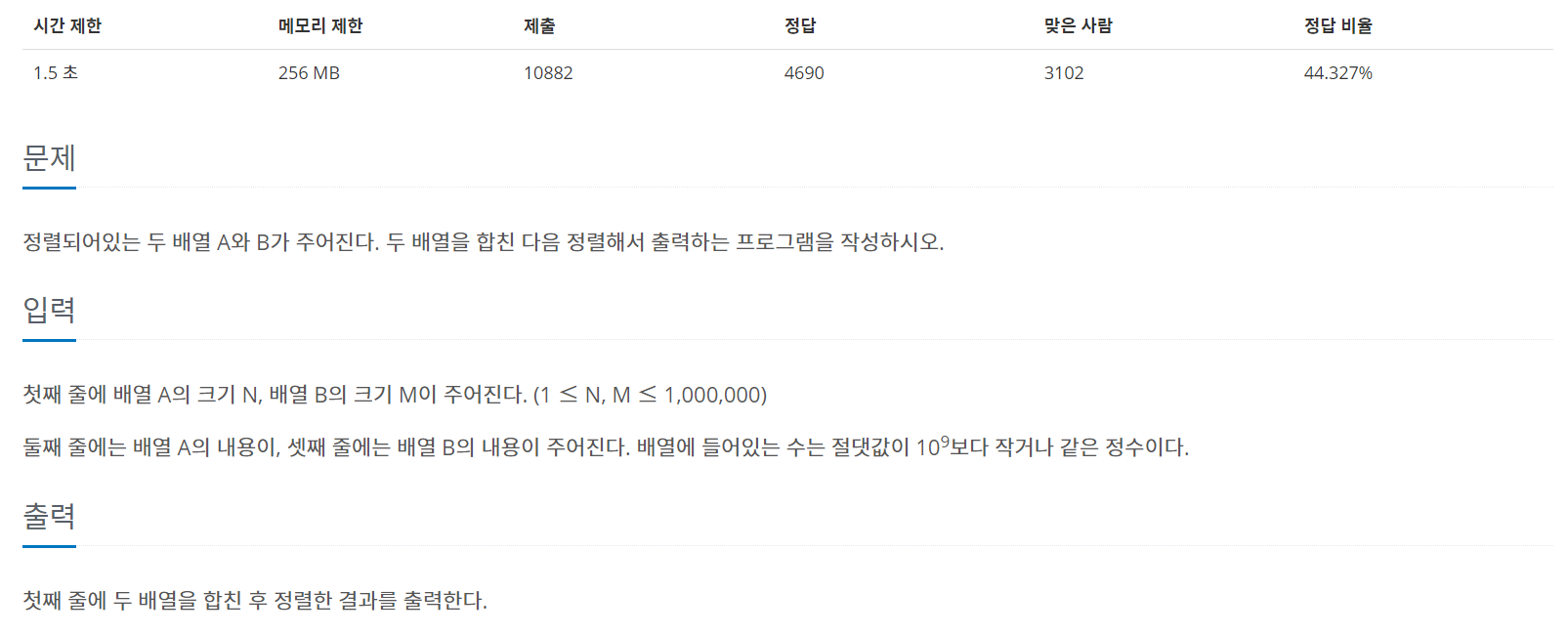 첫째 줄에 배열 A의 크기 N, 배열 B의 크기 M이 주어진다. (1 ≤ N, M ≤ 1,000,000) 둘째 줄에는 배열 A의 내용이, 셋째 줄에는 배열 B의 내용이 주어진다. 배열에 들어있는 수는 절댓값이 109보다 작거��