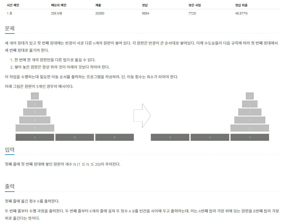 세 개의 장대가 있고 첫 번째 장대에는 반경이 서로 다른 n개의 원판이 쌓여 있다. 각 원판은 반경이 큰 순서대로 쌓여있다. 이제 수도승들이 다음 규칙에 따라 첫 번째 장대에서 세 번째 장대로