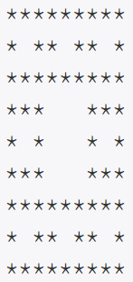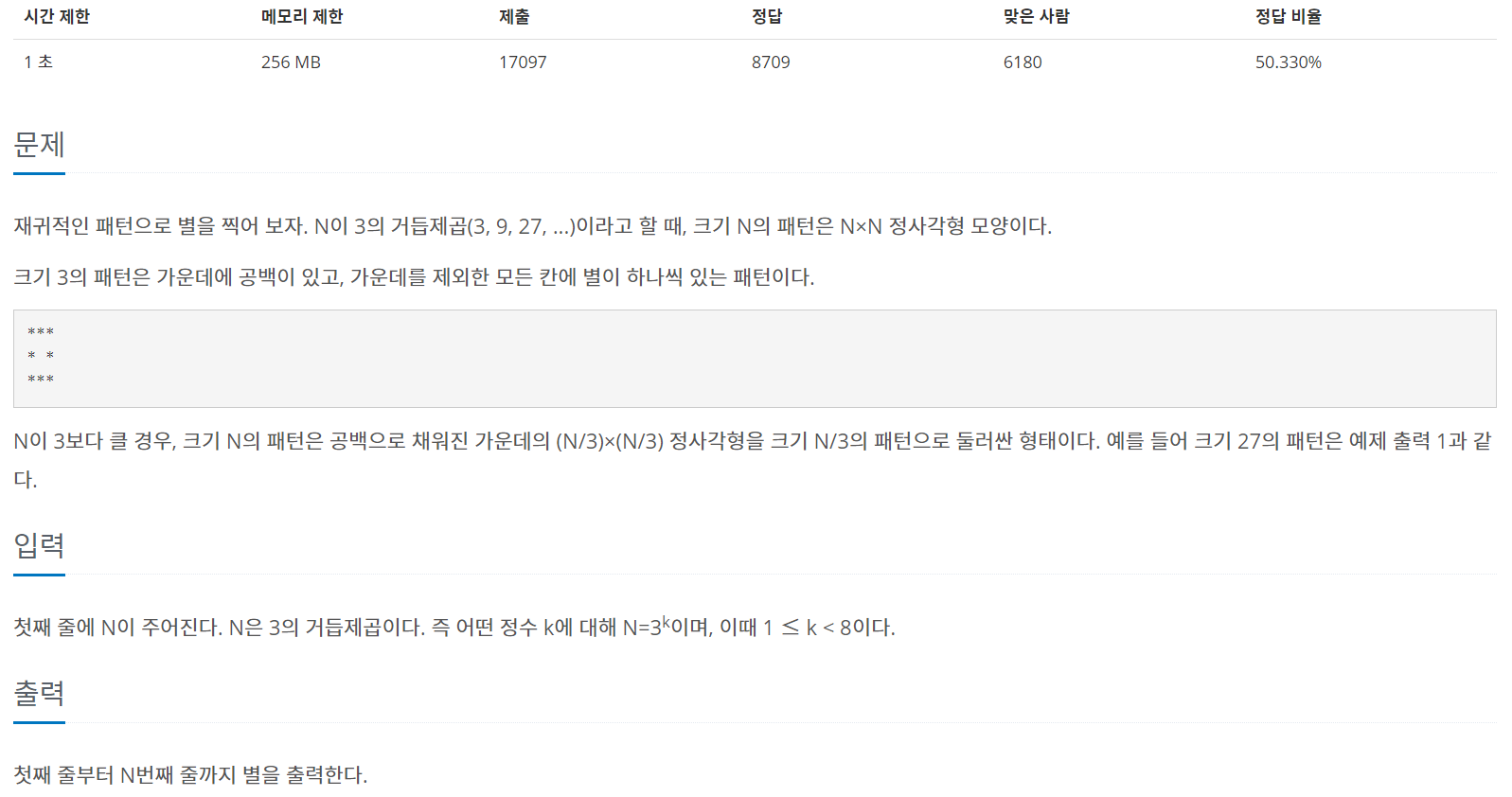 재귀적인 패턴으로 별을 찍어 보자. N이 3의 거듭제곱(3, 9, 27, ...)이라고 할 때, 크기 N의 패턴은 N×N 정사각형 모양이다. 크기 3의 패턴은 가운데에 공백이 있고, 가운데를 제외한 모든 칸에 별이 �
