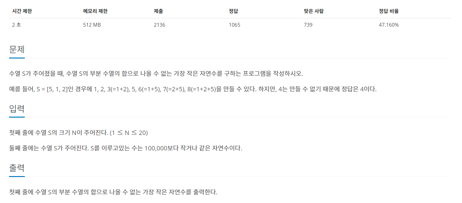 수열 S가 주어졌을 때, 수열 S의 부분 수열의 합으로 나올 수 없는 가장 작은 자연수를 구하는 프로그램을 작성하시오. 예를 들어, S = [5, 1, 2]인 경우에 1, 2, 3(=1+2), 5, 6(=1+5), 7(=2+5), 8(=1+2+5)을 만들 �